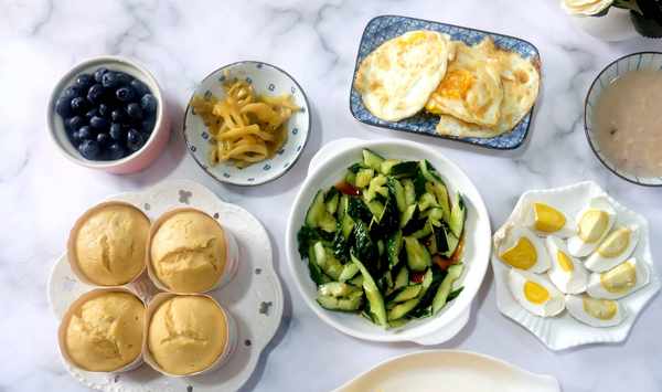 早餐一:小米糯米麥仁粥、紅糖發糕、拍黃瓜、煎雞蛋、咸鴨蛋;早餐粥很簡單,用小米、糯米、三色藜麥、麥仁洗凈,加上清水一起放進電飯裡,啟動預約功能即可,早上起來就能喝到營養美味的粥,特別方便。