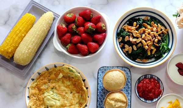 早餐九:南瓜小米糊、白灼蘆筍、草莓奶油蛋糕;南瓜小米糊做法,南瓜去皮切成小塊,和小米一起放進鍋裡,加入清水煮熟,再用料理機攪拌成米糊即可。濃度可以根據自己的喜好來調整,水少則濃,水多則稀。