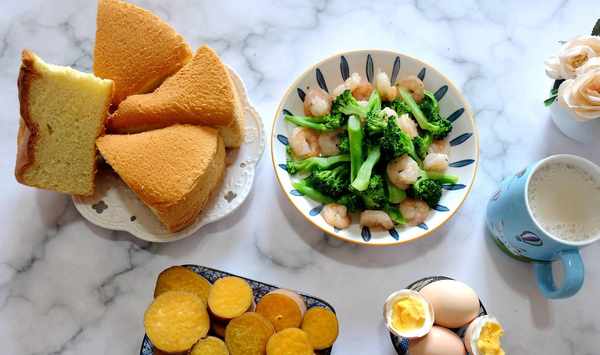 早餐二:紅豆玉米糯米豆漿、原味戚風蛋糕、西蘭花炒蝦仁;早餐喜歡喝豆漿,提前泡上紅豆、黃豆,早上再用泡好的豆子,加上新鮮玉米粒、糯米一起放到豆漿機裡打成豆漿,口感香濃,好喝又營養。