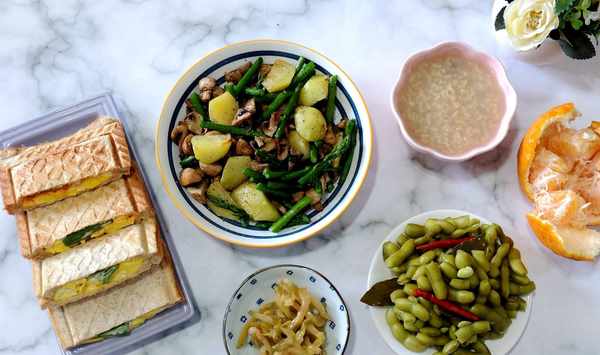 早餐七:紅棗米粥、雞蛋秋葵三明治、土豆口蘑烤蘆筍、鹽水毛豆;三明治是快手早餐主食之一,秋葵提前煮2分鐘後撈出,切成小段,雞蛋加鹽炒成雞蛋塊,取兩片全麥面包中間夾上奶酪片、雞蛋、秋葵、番茄醬、沙拉醬,放到三明治機裡加熱封邊,再對半切開即可,這樣的早餐主食簡單省事又好吃,全傢都很喜歡。
