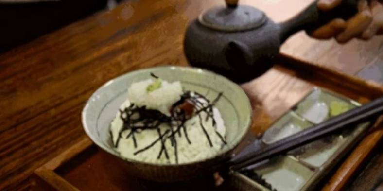 其做法,一壺燒開茶湯,倒入可口白皙的米飯中,橙黃的茶湯迅速被米飯吸收入味,加上梅幹、海苔、熟芝麻、醬油、鹽、綠葉菜,等一系列輔料,米飯之中既有茶葉特有的茶香,還有輔料調料的香味,令人食指大動。