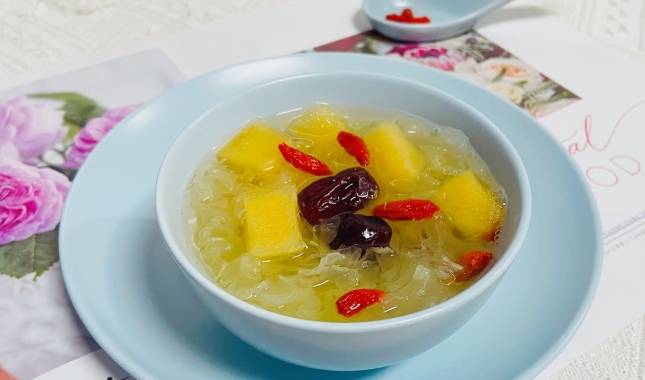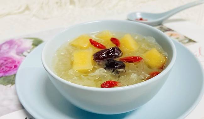 7、銀耳煮好瞭以後再把蘋果塊下進去。紅棗還有枸杞,冰糖都下進去繼續煮5分鐘左右,就可以關火瞭。一碗元氣滿滿的銀耳湯做好瞭,口感清甜,夏天放冰箱內冷凍一會更美味,喝下去全身舒服。養顏美容,可潤肺止咳,心動不如心動,快來試一試吧。
