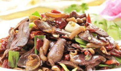 4、炒鍋燒熱,加入花生油燒熱,將雞肉、魚丁、鴨肝、鴨肫燒熱,滑起,倒油瀝幹;