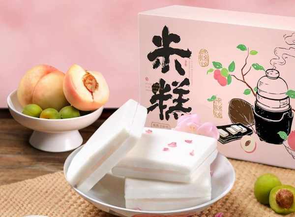 李子柒品牌將白桃和青梅熬成的果醬,夾於蒸出來的米糕中,模樣白糯粉潤、色澤可人。信手拈來一塊放入嘴裡,純白綿潤、米香襲人,齒間領略到米糕蓬松軟糯的訊號,桃和青梅自然而清新的果醬就瞬間湧入舌尖,風味綿延、令人久久回味。