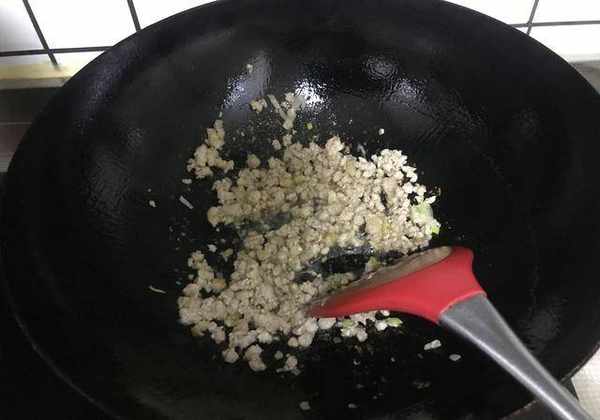 2、熱鍋熱油後,將切碎的五花肉末到其一半,混合蔥白末和薑末一起下鍋,煸炒變色,如圖所示