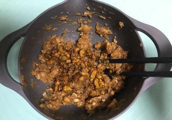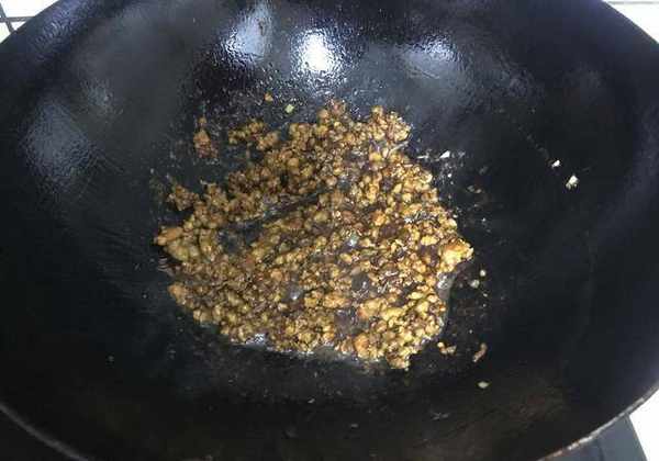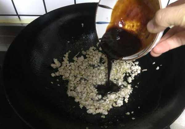 7、繼續再倒入炒好的肉末醬,如圖所示。