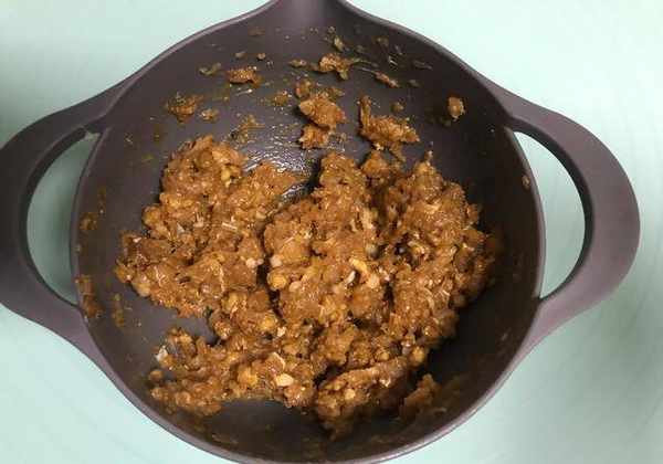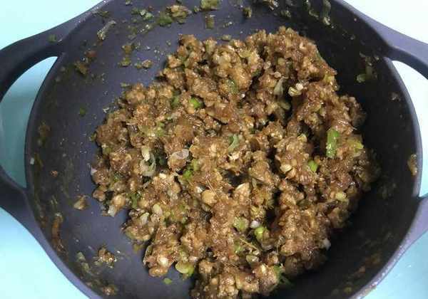 10、最後再放入香油,同樣按照一個方向來進行攪拌均勻,這樣餡料部分就制作好瞭,如圖所示。