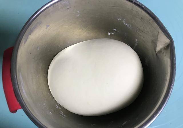 11、來說一下面團的制作:先用水將酵母融化,然後邊倒入面粉中,邊用筷子進行攪拌至絮狀,再下手將其混合揉成一個光滑的面團,揉好的面團,整體是有些偏軟的,蓋好保鮮膜進行發酵,如圖所示。