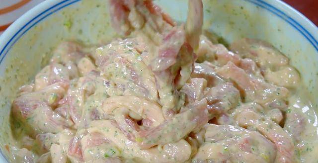 7.把醃制好的肉倒進面糊中,攪拌均勻,讓肉條都裹上面糊。