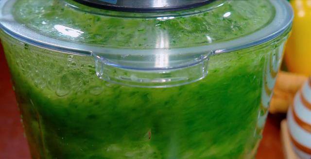 4.一根青瓜用鹽搓洗幹凈表面,再把它削下來,放入攪拌機中,加入一碗的清水,把它攪打均勻。