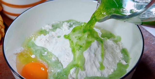 5.碗中加入一包酥肉粉,約250克,再磕入一個雞蛋,再倒入適量的青瓜汁,一直攪拌到粘稠。