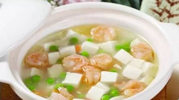 豆腐300克、鮮蝦100克、豌豆20克、玉米粒30克、雞蛋1個、高湯適量