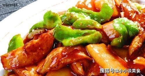 3.將茄子倒入油鍋,炸至金黃色,加入青椒丁一起挑;