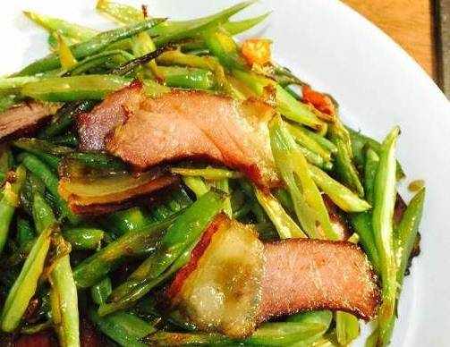 3.蒜爆香,加入切碎的培根炒至出油;加入四季豆、黑蘑菇和辣椒片,加入香料攪拌均勻。