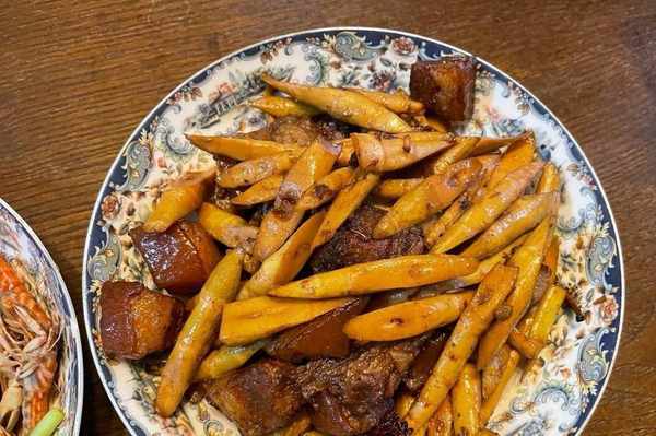 【紅燒肉燒筍】傢人心心念念的紅燒肉,終於安排上瞭。春筍跟五花肉是妥妥的最佳CP,春筍可以吸收五花肉多餘的油脂,而五花肉也吸附瞭春筍特有的鮮香,兩者搭配吃起來不僅不油膩,還特別的入味。烹制前,五花肉和春筍都要提前焯燙,焯燙五花肉是為瞭衛生和去腥,焯燙春筍是為瞭去除草酸,之後就是傢常的紅燒肉制作流程,聽朋友說,這道菜每次上桌就沒剩下過,次次光盤。