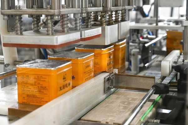 在位於福州市的福建茶葉進出口有限責任公司福興茶葉加工廠流水線上拍攝的罐裝的茉莉花茶(2023年4月11日攝)。新華社記者 周義 攝