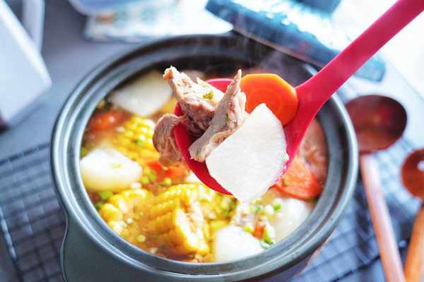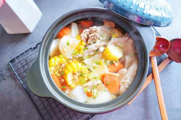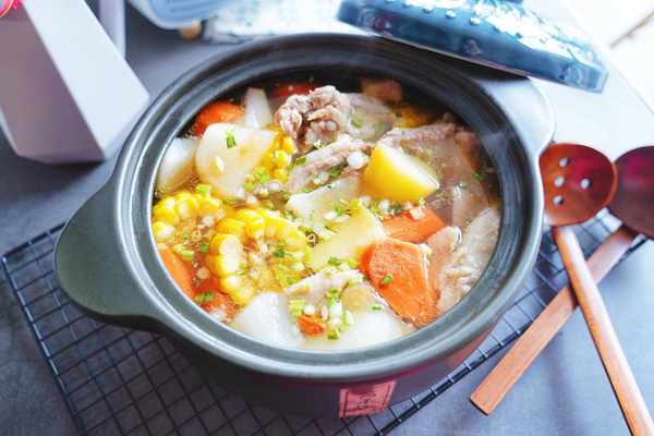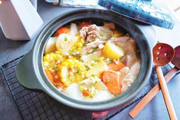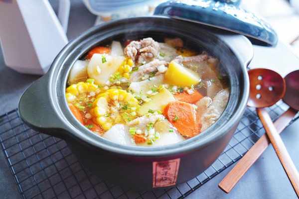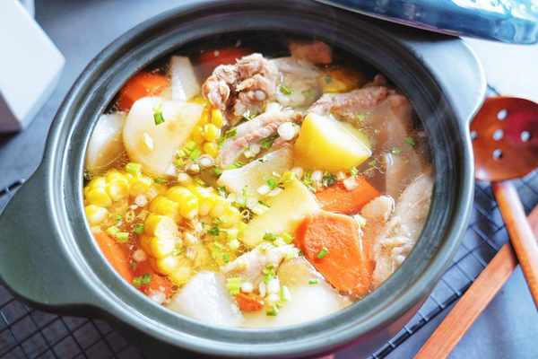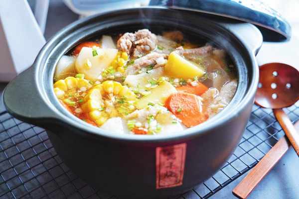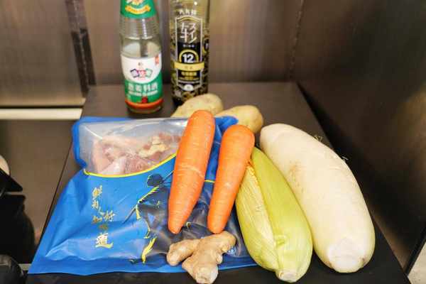 【蘿卜土豆玉米燉羊骨湯煲】羊骨500克,白蘿卜1根,胡蘿卜2根,土豆2個,甜玉米1根,薑1塊,當歸片1片,八角2個,小蔥1根,蔥薑料酒5毫升,輕鹽松茸醬油15毫升,鹽5克,清水1000毫升