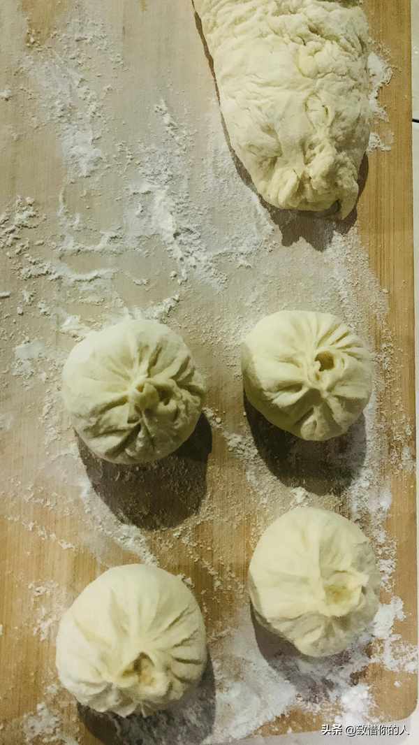 發酵好的面團搟好切小劑子,搟成面皮放入肉餡包起來。包好不要急著上鍋蒸,有條件蓋上保鮮膜繼續發酵