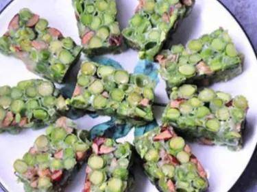 制作方法:1、新鮮豌豆剝殼清洗幹凈,水開中加入一勺小蘇打,水開後加入少許油,倒入豌豆煮5分鐘撈出用涼水沖洗一遍,瀝幹水份備用
