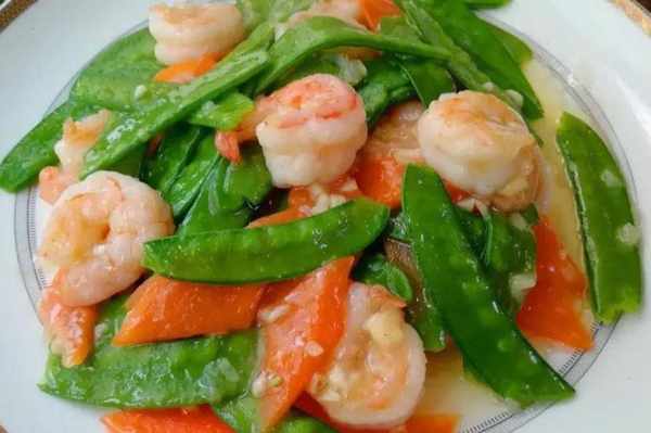 3、鍋中燒熱倒入少許油,放入蝦仁炒至變色,倒入荷豆紅蘿卜炒熟調味即可。