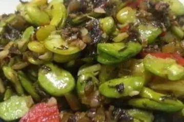 材料:蠶豆、雪菜、紅辣椒