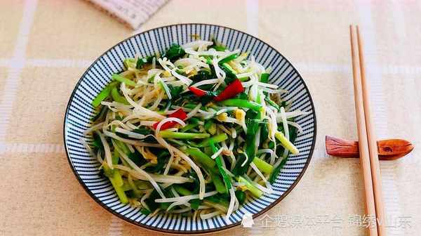 韭菜250克、豆芽250克、瘦肉60克、薑2片、蒜2瓣、指天椒2個、生抽1勺、鹽2克、雞精1克、胡椒粉1克。