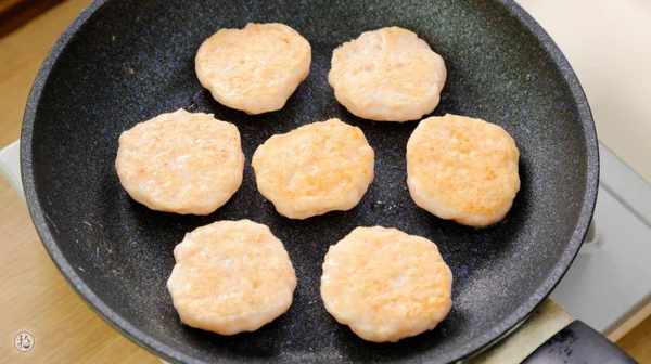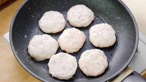 2.戴上手套,把蝦泥整理成餅狀(圓形或者方形都可以);平底鍋刷入薄油,放入蝦餅,中小火煎至兩面金黃上色。