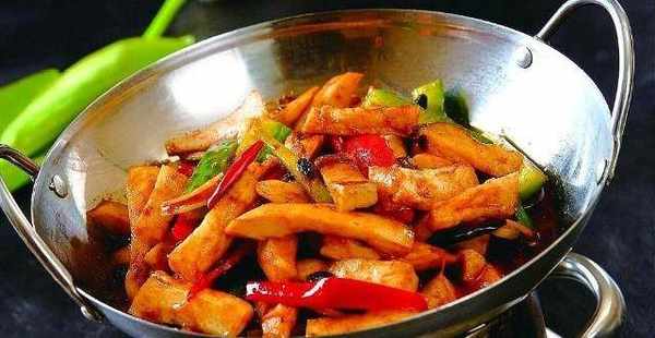 4、接著將切好的青紅椒先倒入鍋中翻炒,加入生抽翻炒。