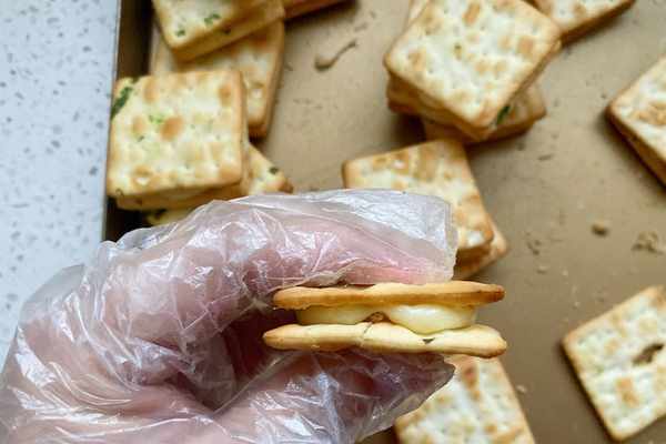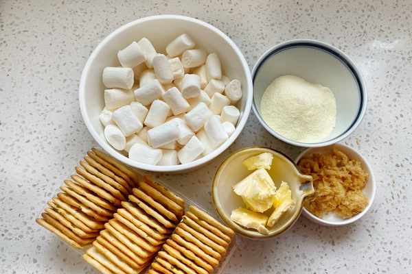 【食材】:棉花糖150克,無鹽黃油60克,奶粉50克,豬肉松20克,香蔥方塊餅幹2包