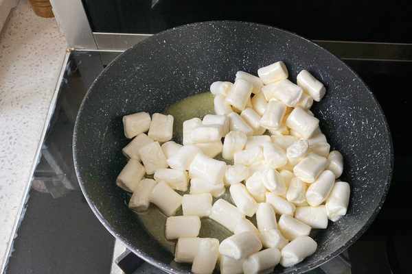 4、把奶粉倒入在混合好的棉花糖裡,關火,快速拌勻至奶粉融化。