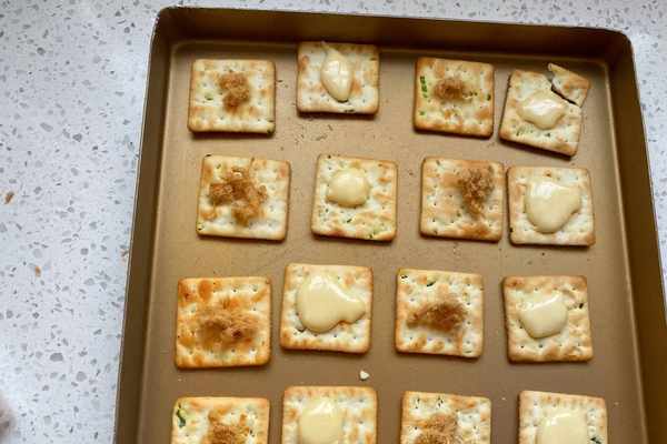 6、把香蔥方塊餅幹鋪在烤盤裡,一塊放上肉松適量,一塊舀上牛軋餡。