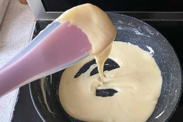 5、用刮刀鏟起一塊,能看到明顯拉絲,牛軋夾餡就做好瞭。