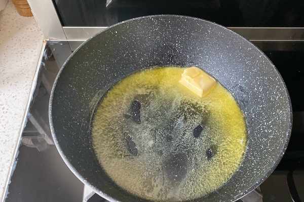 2、首先把無鹽黃油,放入不粘鍋裡,開啟中小火,用刮刀慢慢攪拌至黃油融化成液態。