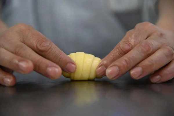 在鄒文君手中,一塊平淡無奇的起酥面團不到6秒就可以變換不同的形狀:牛角形、彎形、圓形……然後淋上蛋液、送入烤箱,待烘焙完成,自然持久的香氣瞬間彌漫在空中。“這讓我很有成就感。”鄒文君說,在她看來,好利來的甜點就像精致的藝術品,每一款都萃取精華、極盡巧思。“產品設計真得非常棒,太漂亮瞭。”