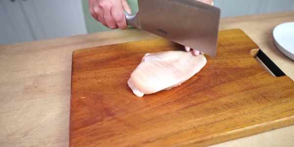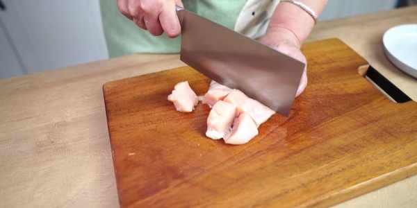 第一步:用刀背給雞肉拍打按摩,將肉拍的松散,方便入味,再改刀切塊;