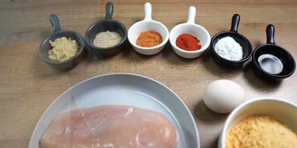 首先,準備的食材及配料有:雞胸肉、雞蛋、面包糠、鹽、蒜蓉、胡椒面、孜然粉、辣椒面、淀粉、食用油。