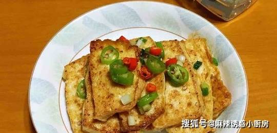 3.用不粘鍋,中火煎至兩面金黃色。貼士:放油後油溫一熱在鍋裡撒點鹽,這樣豆腐入味,也可以同時加點白胡椒粉