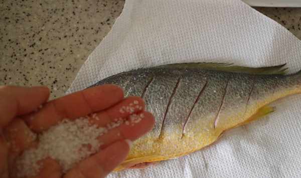 3.然後用廚房紙吸幹魚身上的水分,將料酒澆到魚身上,然後把鹽均勻地塗抹在魚身表面,醃制20分鐘左右,便於入味和去腥。
