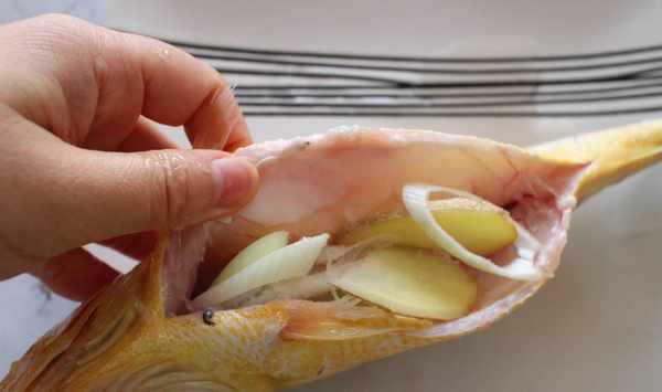 2.蔥白切片,生薑切片塞進魚肚子裡面,然後撒少量鹽。