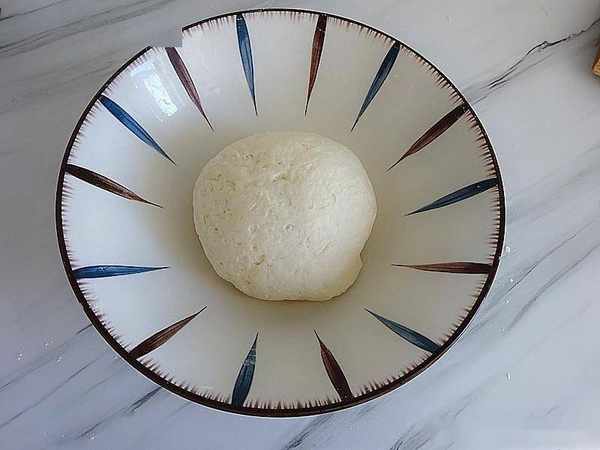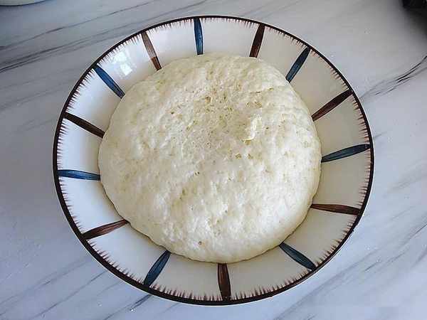 3、揉好的面團溫暖處發酵2倍大、這時候小蘇打用2湯勺溫水融化,淋在面團上、揣入發好的面團中。