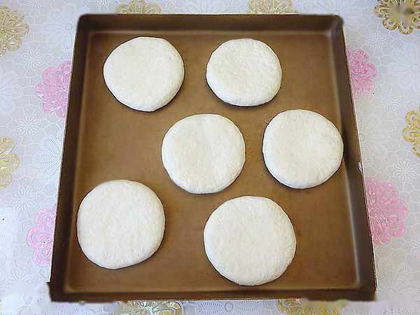 6、把小面團揉圓後搟成一厘米厚的餅,擺入烤盤。