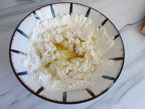 1、糖和鹽放入面粉中拌一拌,溫水融化酵母把面粉攪拌成絮狀後放玉米油,在用筷子拌一拌後下手和面。