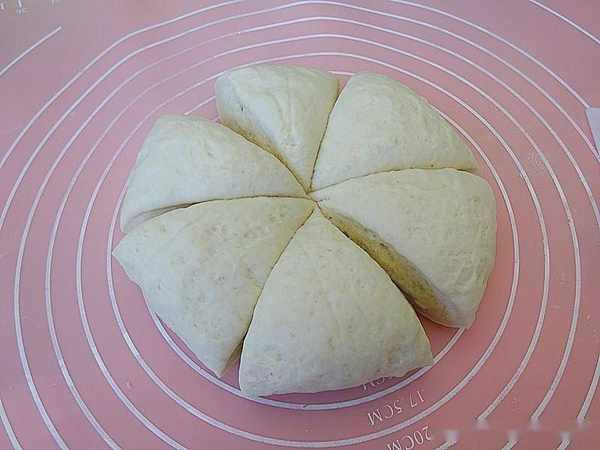 4、面團揣進小蘇打水,揣勻瞭也就把面團排氣瞭,揉勻,分成6個均勻的小面劑子,這時候面團的切面沒有大氣孔,如果有大大的氣孔、說明還需要排排氣、揉一揉。