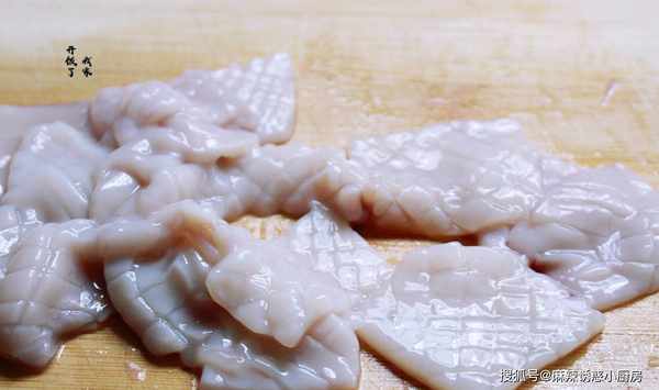 3.在魷魚裡面切花刀,背面切花刀的話就不會翻花瞭。