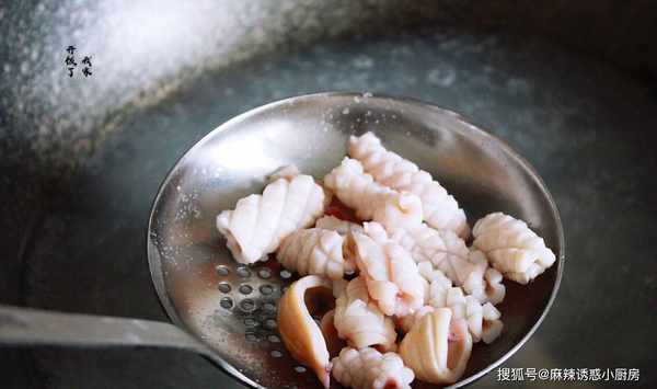 5.魷魚想要脆嫩不發老,這個步驟要牢記:沸水中淋入料酒,再放魷魚,魷魚焯水20秒就出鍋,可保持脆嫩的口感,同時起到去腥的效果。(時間不能太長)