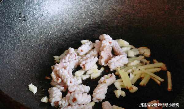 6.熱油爆香蒜末和薑絲,放魷魚進行煸炒。