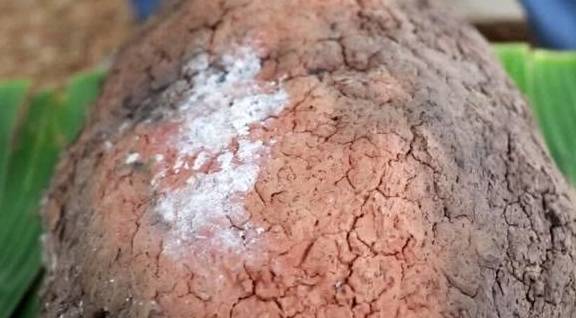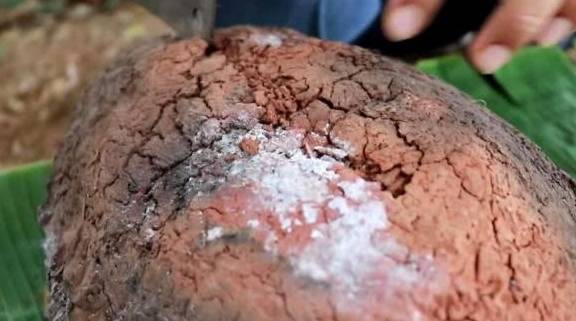 如果在城裡,也可以用烤箱來做,可以把雞肉剁成塊後用荷葉包裹起來,這樣再用泥土包起來放進烤箱裡面烤,也比較容易烤熟,吃起來也比較方便,朋友把烤好的烤雞撈出來,然後把表面的泥土敲開。