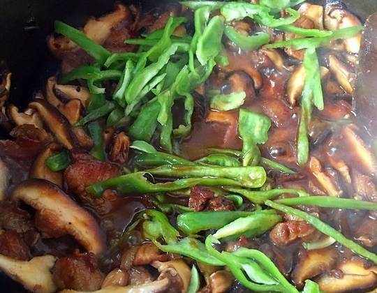 香菇100克、五花肉400克、柿子椒2個、薑1個、小蔥少許、蒜少許、料酒適量、精鹽2克、蠔油適量、糖3克、老抽5克