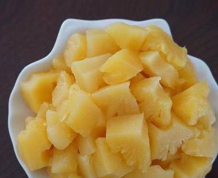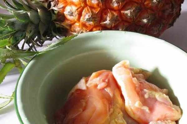 2.將菠蘿去皮,洗凈,切成丁;鍋中放清水,待水沸後放雞塊,待雞塊出花或出球狀時撈出。