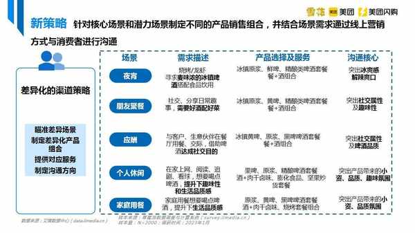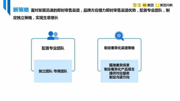 新策略:面對發展迅速的即時零售渠道,品牌方應借力即時零售渠道優勢,在銷售部下設獨立的即時零售團隊,並為其配備財務、策略、IT等資源支持和獨立預算。在不同核心場景和潛力場景制定不同的產品銷售組合,同時結合場景需求通過線上營銷方式與消費者進行溝通,實現生意增長。